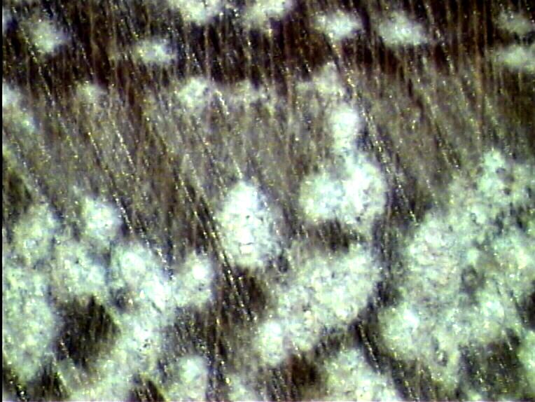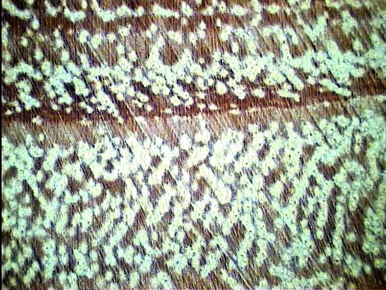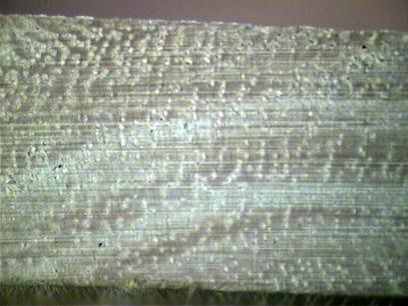 Vasos muy pequeños algo agrupados, numerosos con cierta agrupación radial, visibles con lupa. Radios poco visibles con lupa. Parénquima muy visible a simple vista, vasicéntrico algo confluente uniendo 4 a 6 vasos radialmente.