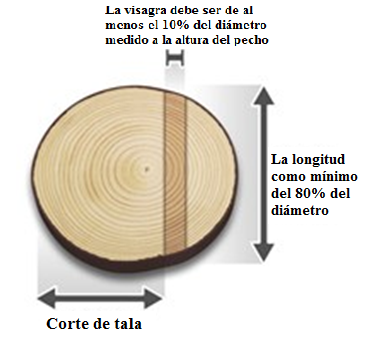La bisagra es el elemento más importante a la hora de garantizar un derribo seguro y limpio. Se denomina bisagra a la sección de madera sin cortar que se deja entre el corte direccional y el corte de tala, ya que dicha madera de sostén actúa como si fuera una bisagra. La función de la bisagra es dirigir el árbol en su caída. La madera de la bisagra deberá poseer un grosor uniforme y su longitud deberá ser equivalente a al menos el 80 % del diámetro del árbol medido a la altura del pecho. La bisagra deberá tener una anchura equivalente al 10 % del diámetro del árbol medido a la altura del pecho. En el caso de aquellos árboles con un diámetro superior a 30 cm, bastará con dejar una bisagra de aproximadamente 3 cm de ancho. El ángulo de apertura del corte direccional determinará el tiempo en que la bisagra permanecerá intacta. Cuanto menor sea el ángulo, antes terminará rompiéndose la bisagra.