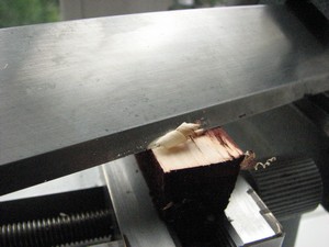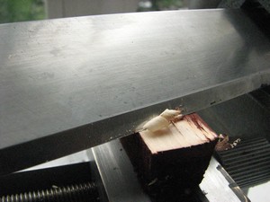 Se enrasa repetidamente la superficie de la pieza de madera con la cuchilla hasta obtener las primeras virutas completas.