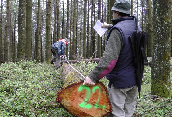La primera inspección de la madera se realiza con el árbol en pie, valorando el tamaño de los troncos, su diámetro, la forma del tronco y el estado de la madera. Esta primera inspección determina el destino de la madera, siendo los troncos de mayor diámetro y de mejor calidad los que se van a destinar a la madera de uso estructural.