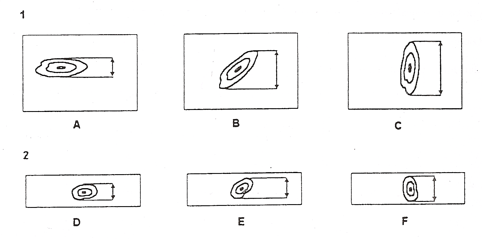 Figura 1: Mediciones de los diferentes tipos de nudo (1: nudos de cara, 2: nudos de canto).