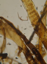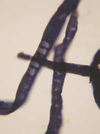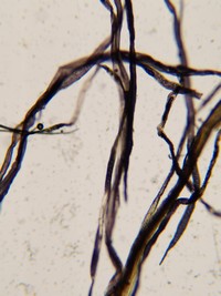 Coloración azulada con Reactivo Herzberg (pasta química).