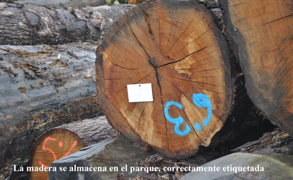 Los troncos vienen en tronzas de 6 u 8 metros, pudiendo existir otras medidas. Al llegar al parque se descargan en pilas y se marcan para identificar el lote y la procedencia.