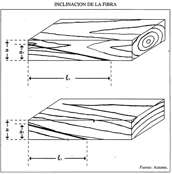 Este defecto se produce cuando la dirección de la fibra no coincide con la dirección del corte o dirección longitudinal de la tabla (largo). Se mide por la relación a/b (figura). Cuanto menor es esta relación, la desviación será más pequeña y la calidad de la tabla mejor. La desviación de la fibra es debida a la curvatura y conicidad del tronco.