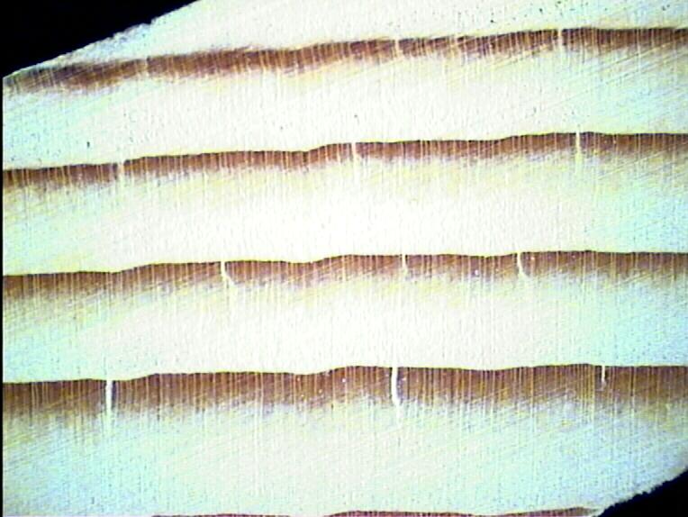 Anillos de crecimiento estrechos, diferenciados y apreciables a simple vista, con poco contraste entre zonas de primavera y verano.