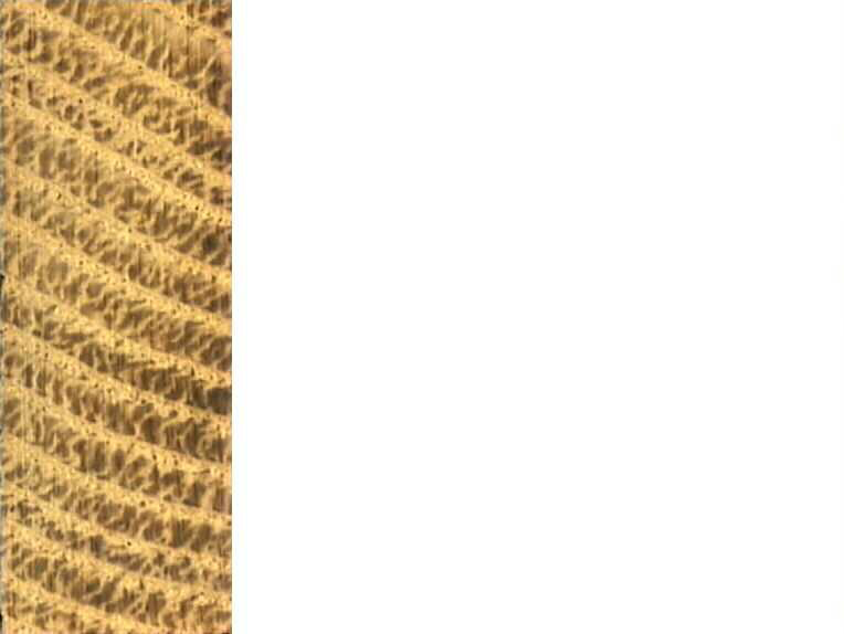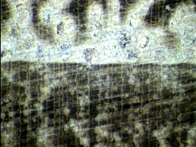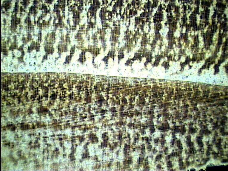 Parénquima visible a simple vista en la zona de duramen mediante líneas perpendiculares a los anillos de crecimiento. Vasos muy grandes.